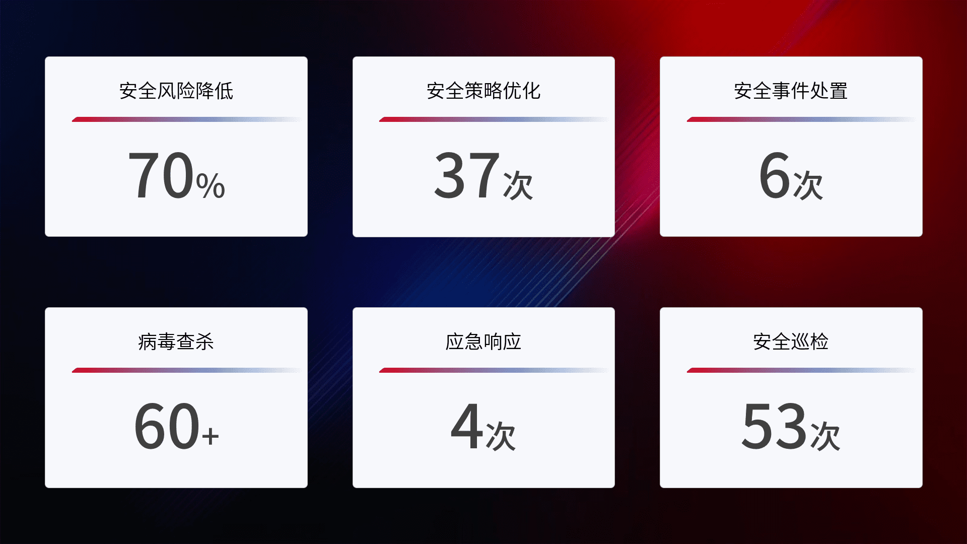 提供全面的安全事件报告体系,,,包括处置报告、、、、周报、、季度和年度总结,,,,结合持续监控,,,,帮助客户深入了解网络安全状况。。